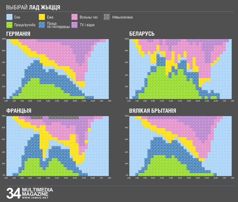 Interesting Infographics. The distribution of employment by hours of the day. Too much learning or working (